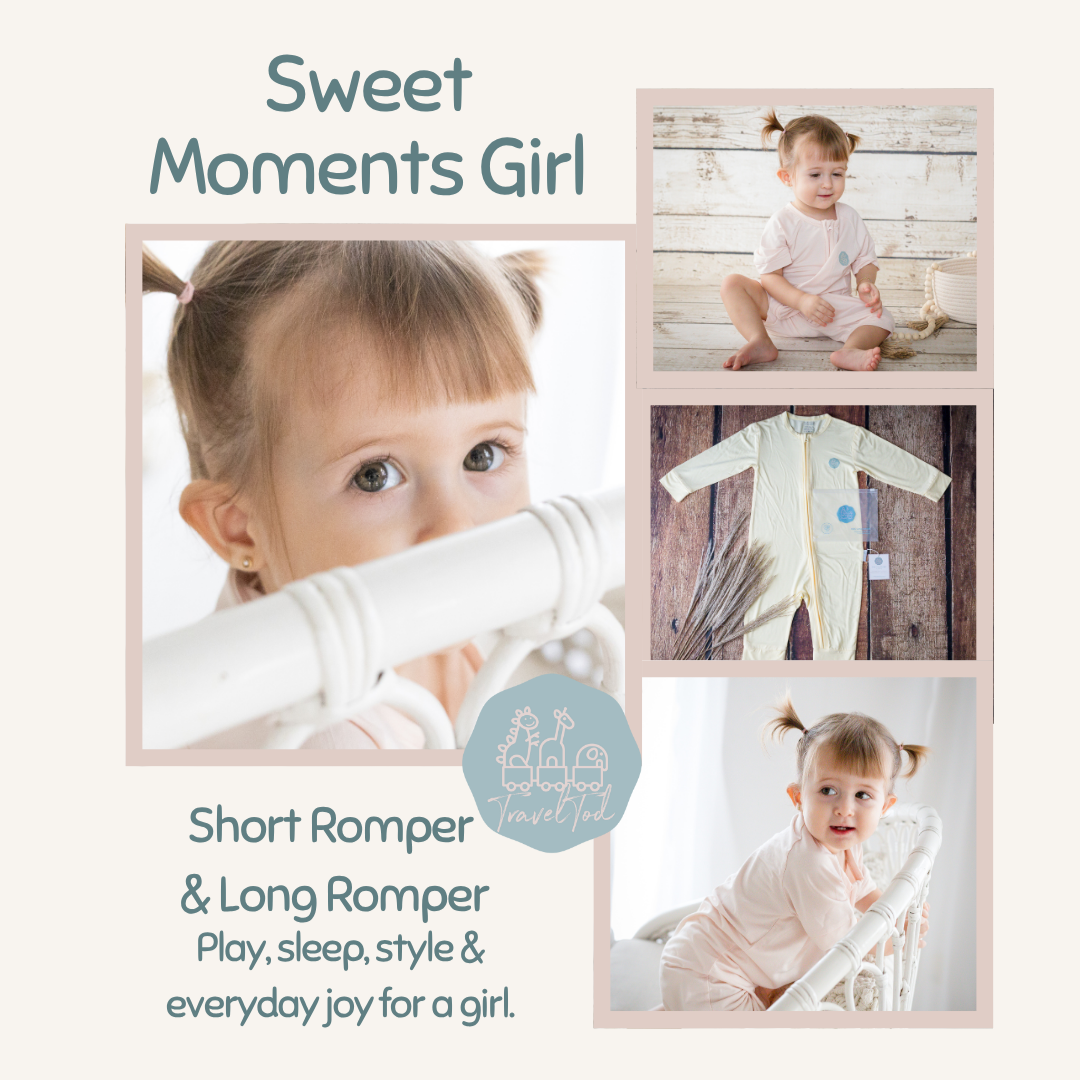 Celebrate a girl's journey of baby and toddlerhood with TravelTod's Sweet Moments Girl bundle, featuring our bamboo Short Rompers & Long Rompers – the perfect combo for both playtime and sleep! Crafted from 95% premium bamboo and 5% spandex, these rompers offer ultimate comfort, stretch, and style.